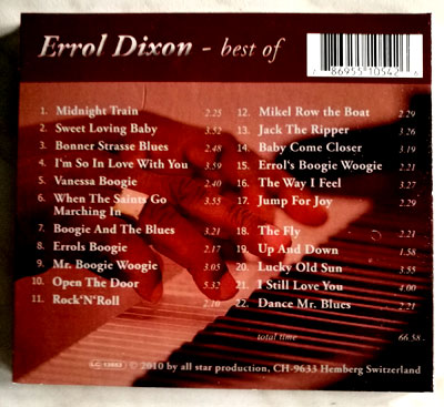Errol Dixon "the hardest working man on stage" präsentiert hier seine grössten hits. sei es solo oder mit band, studioaufnahmen oder livemitschnitte. U.a. sein No 1 hit "Midnight Train" 1961, aufnahmen in Basel Atlantis, seine beliebten "boogie woogie party" aufnahmen bis hin zu seinem letzten album im jahre 2003. Leider ist Errol Dixon anfangs 2023 verstorben.